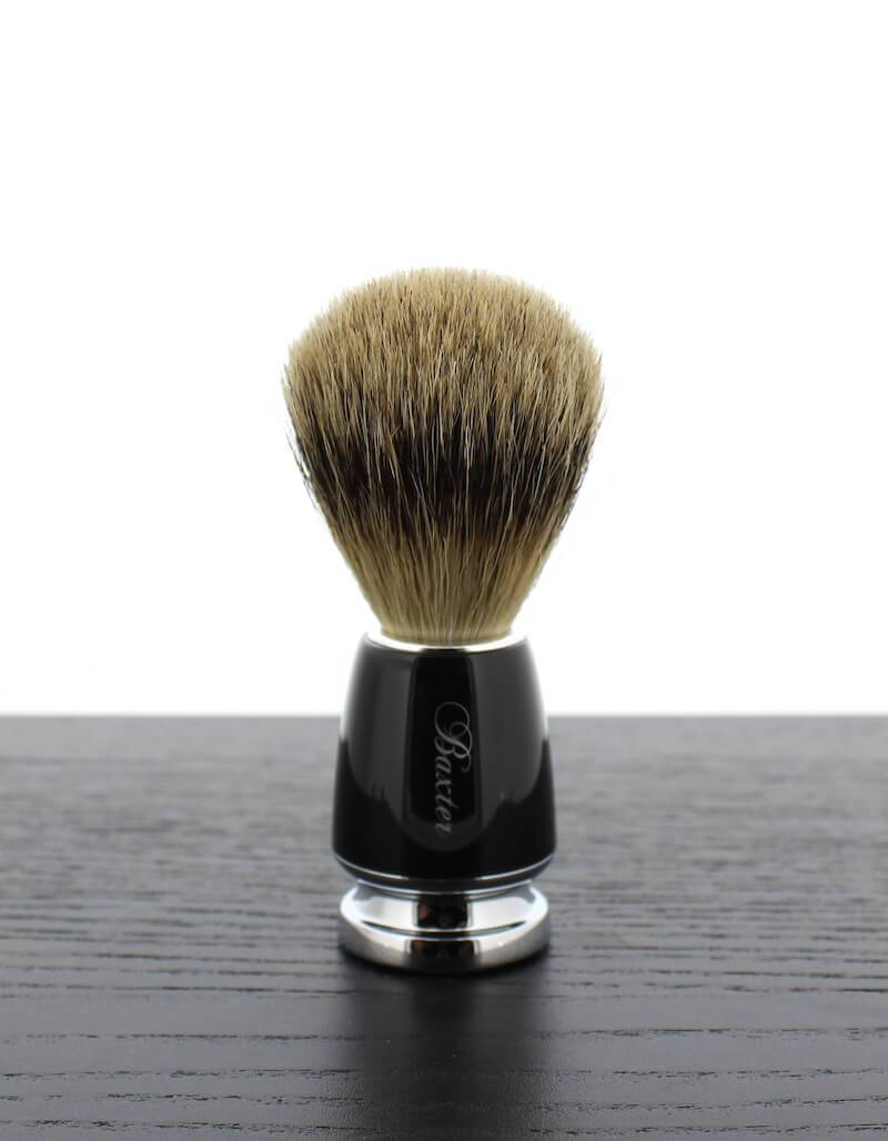 100% Natural Badger brush made with fine SILVER TIP hair, soft and durable. The essential tool to achieve a great shave and a pre-shave tool that helps to lift facial hair, and create lather. WHAT IT DOES Second to the razor blade, the Badger Hair Shave Brush is the essential tool used to achieve the best shave possible. Badger hair has a great ability to retain water (which helps create a lather when mixed with a shave cream) improving the barrier between the razor and skin, lifting facial hair to ensure a smoother shave with less irritation. USAGE 1. Cleanse facial skin. 2. Rinse the brush in warm water, shake off excess water, and apply Baxter Super Close Shave Formula to the top of the badger brush. 3. Work the cream into your beard, using oblique brush strokes. 4. For more lather, dip the tip of the brush in water and add more shave cream.Made in Germany